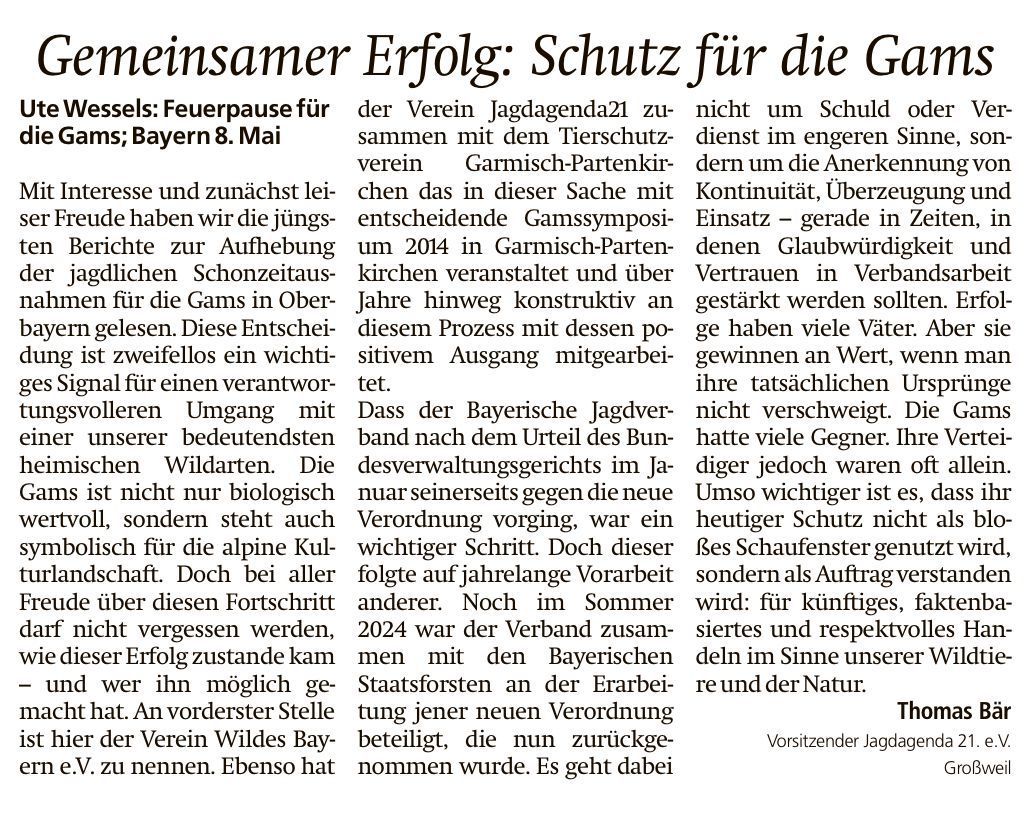 In Zeiten zunehmender gesellschaftlicher Polarisierung, wachsender Entfremdung zwischen Mensch und Natur und einer immer lauter werdenden Debatte um Wildtierschutz, ist es wichtiger denn je, sich zu positionieren – sachlich, faktenbasiert und mit klarem Kompass. Genau deshalb haben wir als Jagdagenda21 e.V. mit unserem Leserbrief in der Süddeutschen Zeitung vom 8. Mai auf die Berichterstattung zur Aufhebung der Schonzeitmaßnahmen für die Gams in Oberbayern reagiert.